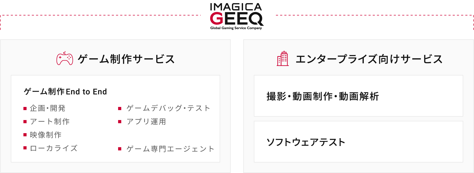 グローバルゲーミングサービスカンパニーを目指す当社の事業の核は、国内外のゲーム企業へ制作サポートを行うゲーム事業です。あらゆるプラットフォームに対応するゲーム企画・開発、ローエンド/ハイエンドを問わないアート制作、プリレンダーからリアルタイムまで幅広く対応する映像制作、深い業界知識と高い言語能力を活かしたローカライズ、さまざまなデバイスに対応するゲームデバッグやユーザーテスト、ゲーム専門エージェントサービスなど、制作のパートナーとしてゲーム制作の全工程をサポートします。