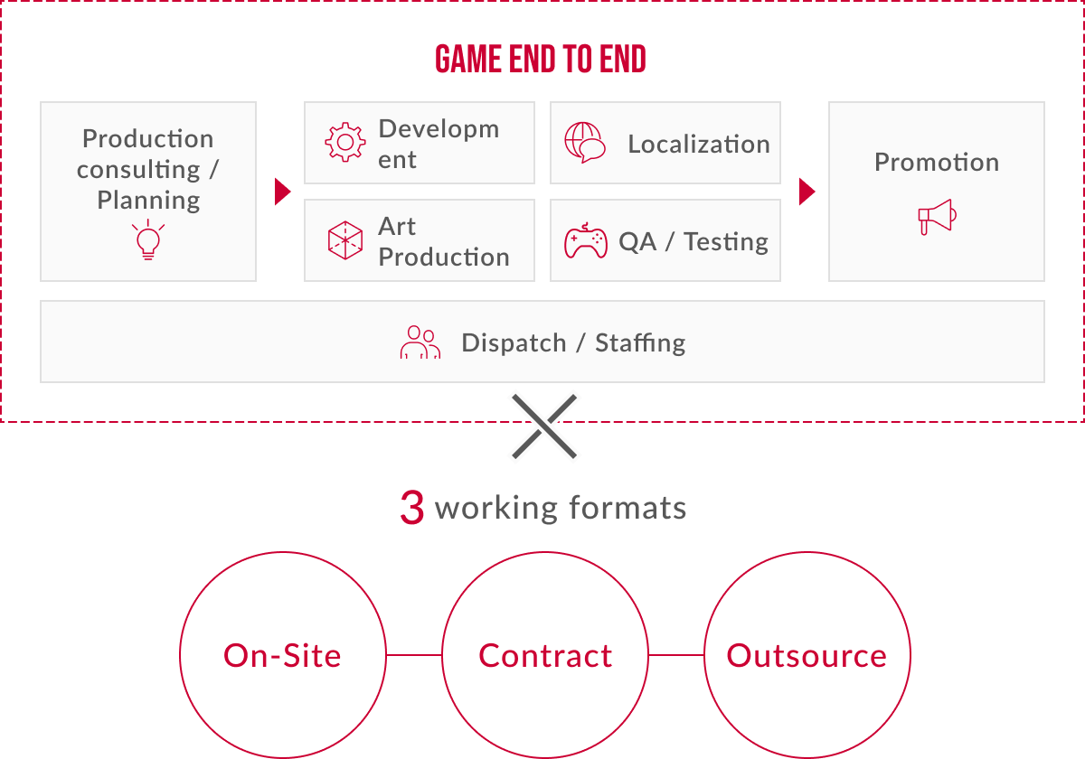 We assist with all game production processes, from planning, development and production to localization, QA and promotion, all in one place. We can join the project at any phase, and our team members utilize their deep knowledge of the ins and outs of game creation to provide comprehensive support across all disciplines.