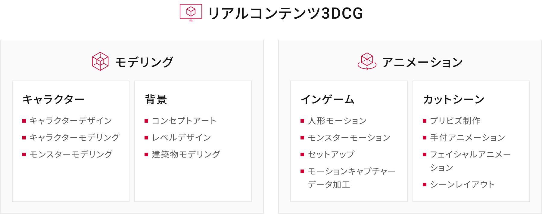 モーションキャプチャーをベースとしたリアルなカットシーン制作から、すべて手付けアニメーションで制作されるデフォルメされた世界観のカットシーンまで、制作ジャンルは多岐に渡ります。字コンテからの制作、絵コンテからの制作、プリビズ制作など、柔軟に制作フローを調整します。