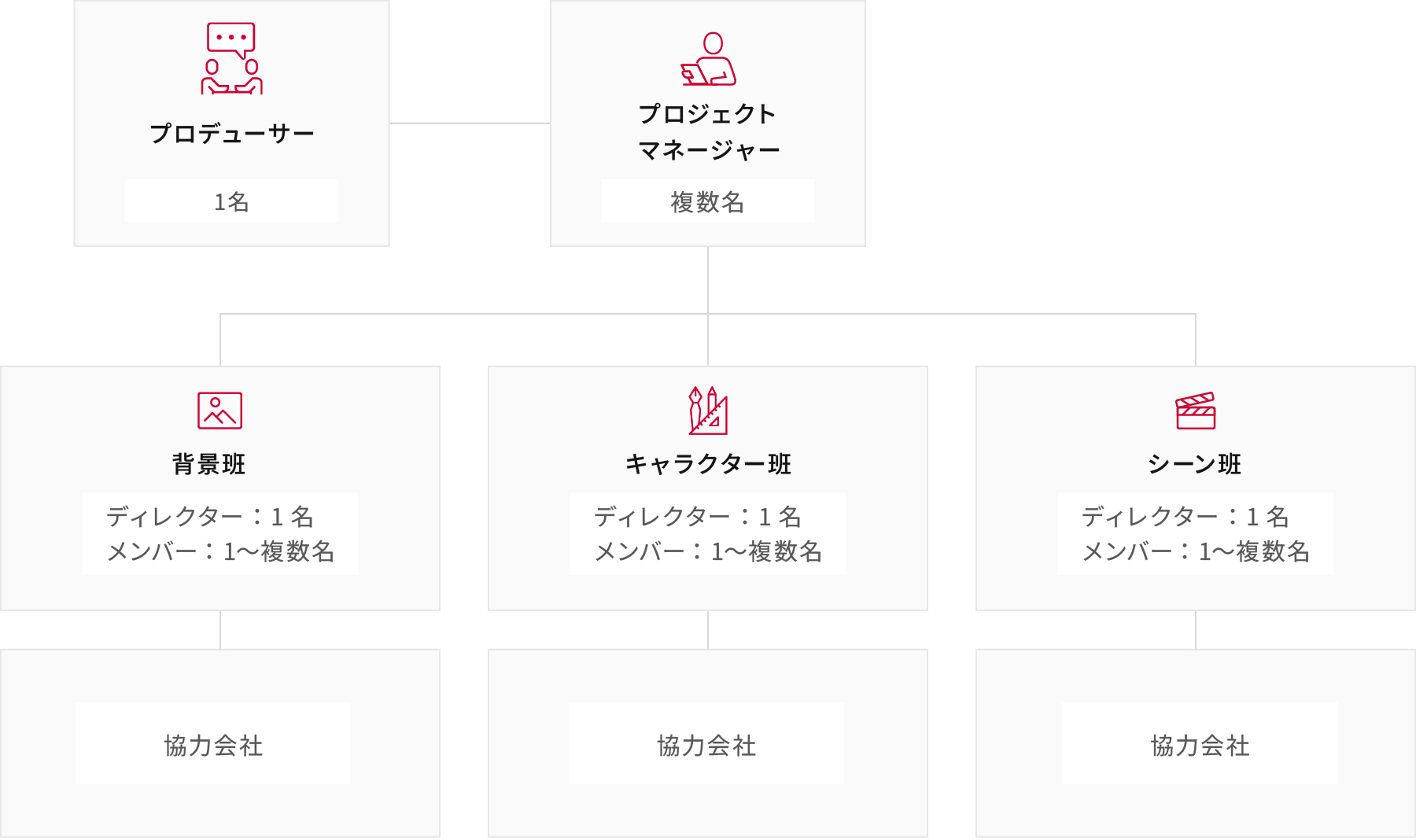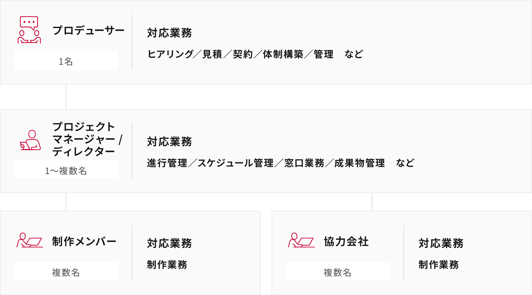 プロデューサーとデザイナーがタッグを組んで営業、商談、見積り、契約まで対応。必要なスキルセットを持つメンバーで最適な制作体制を作ります。